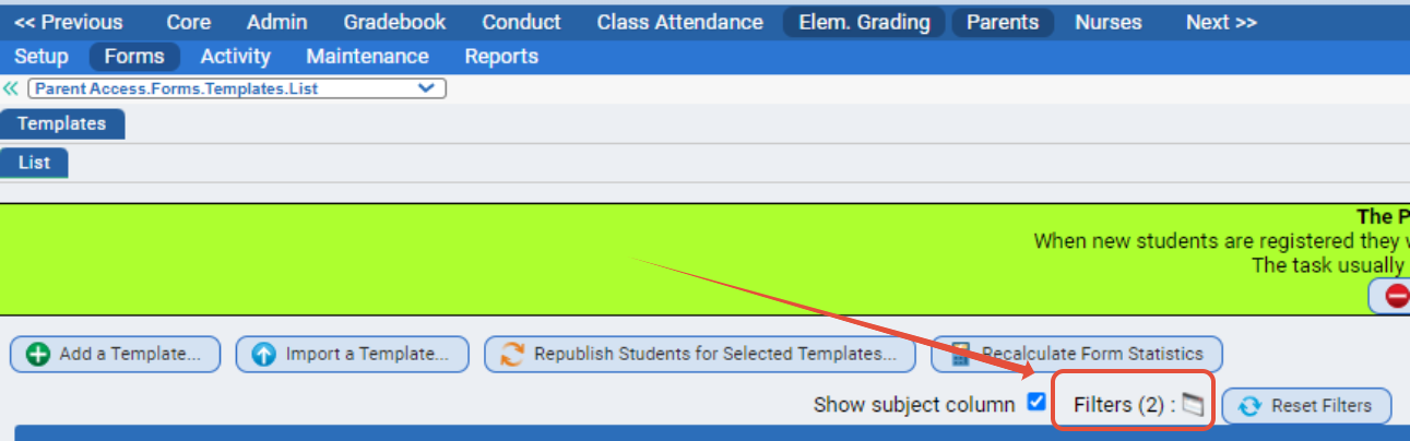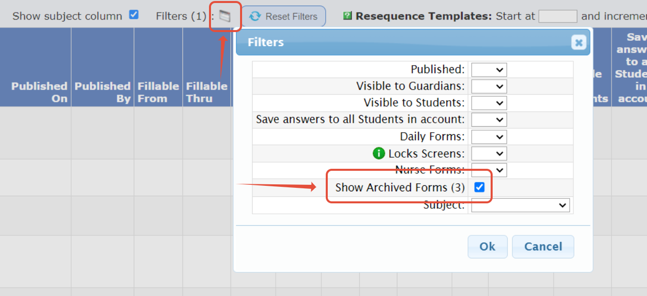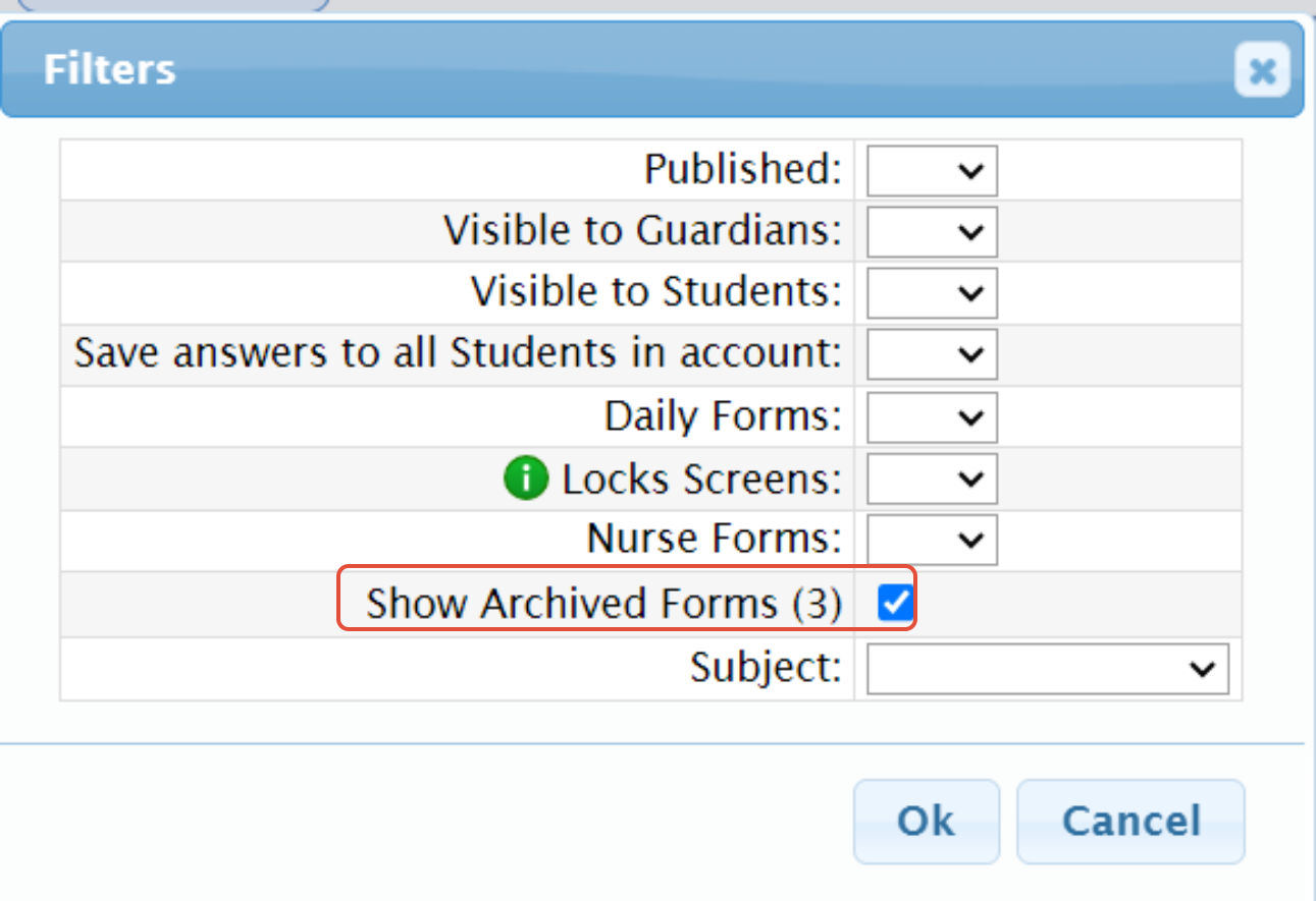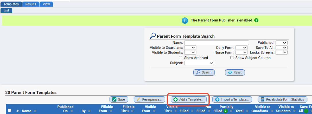 By default, the Parent Access>Forms>Templates>List screen displays only unarchived Templates.