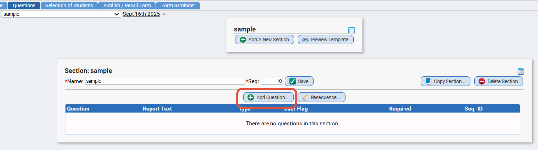 The Parent Access>Forms>Templates>Questions tab is where you create your questions and sections. You can enter a block of text and/or text that requires an answer of some sort so that you can gather info from parent and/or students in the portal.