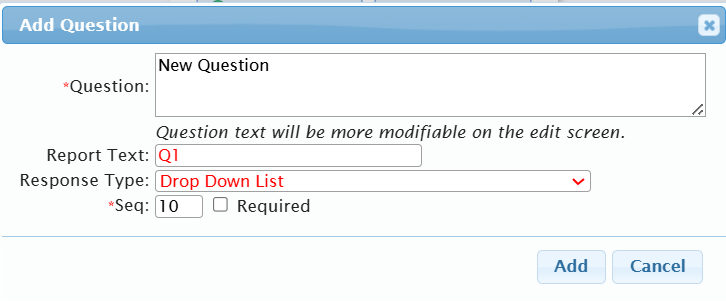 To add a new question, click the "Add Question" button and enter info into the preliminary fields on the pop-up: