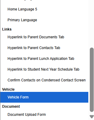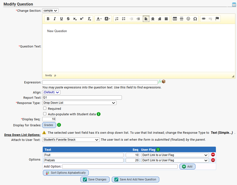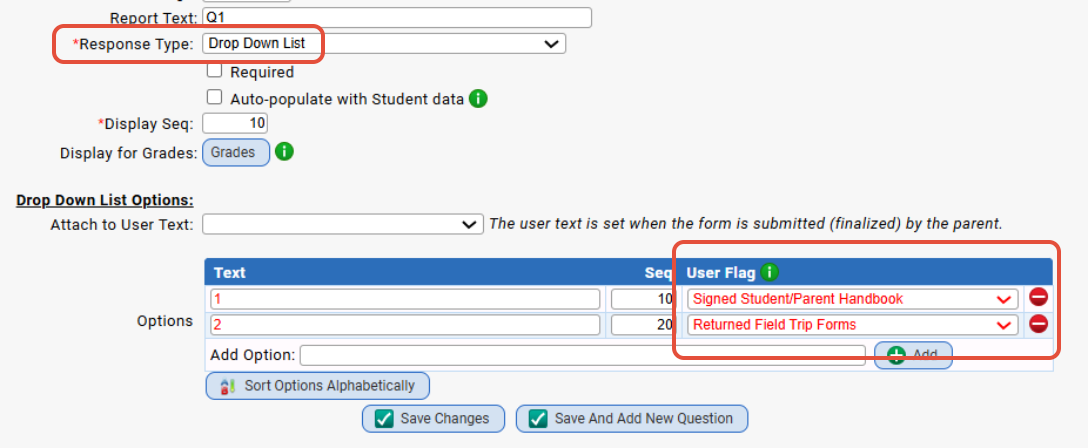 - Drop Down List - A drop down list of predetermined answers Drop down list options can now be tied to student user flags. If an option is tied to a user flag and it is not selected when the form is submitted, that user flag will be unset on the student. The selected user flag will be set when the form is submitted (finalized) by the parent. Any option tied to a user flag that is not selected will be unset. A typical use case would be to have 'Yes' and 'No' options, with the 'Yes' option tied to a user flag. Note: If the parent selects 'No', the user flag will be unset. Another use case would be to have multiple options, each tied to a user flag. This would be useful for mutually exclusive user flags, since any options the parent doesn't choose will result in the corresponding user flag being unset.