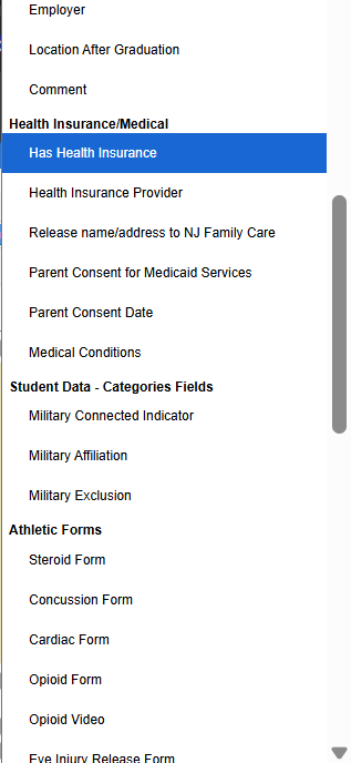 Never write data back to Student fields in Genesis. (for Response Types that directly update fields in Genesis such as 'Has Health Insurance') | If checked, the following fields will update on a students form, but not in the corresponding fields on the students record - Has Health Insurance, Health Insurance Provider, Release name/address to NJ Family Care, Military Connected Indicator, Medical Conditions. |