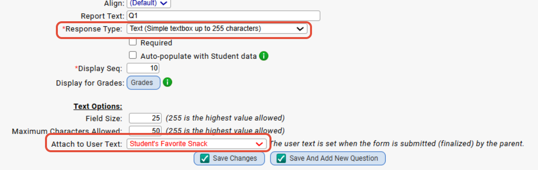 - Select the user text field that you would like to tie the parent response to and click 'save changes'