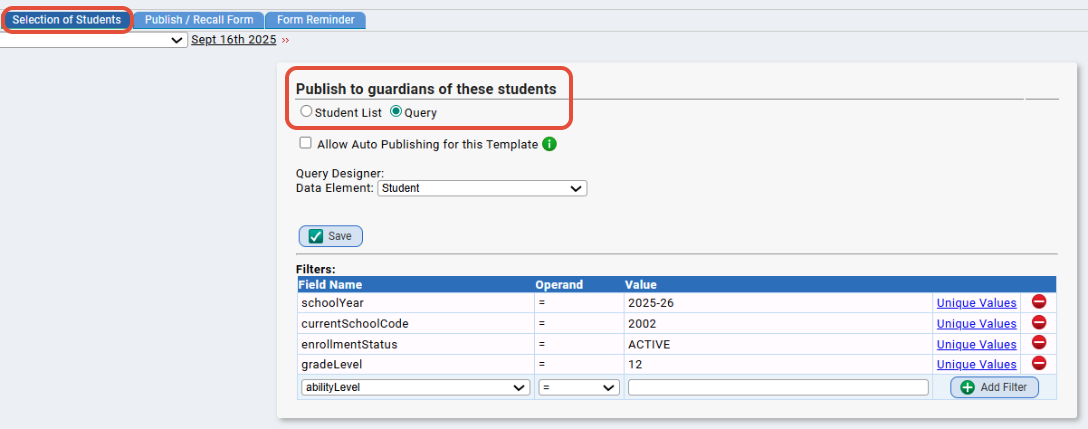 There are two ways to choose how you want to select the students you are going to publish the form to: By Query and by Student List
