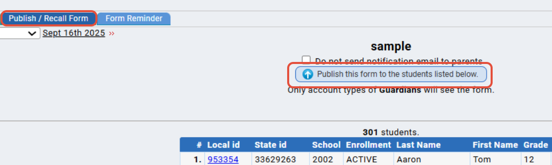 - You can publish forms to guardian parent user accounts by student list or query.