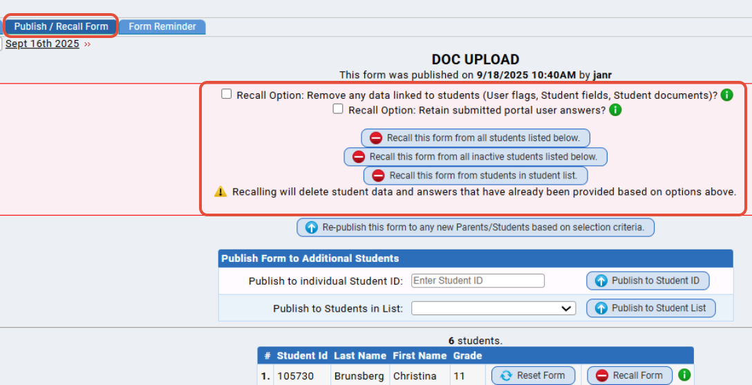 - Recall Form - This will recall the form for a single student. Keep in mind if you are using the Parent Form Publisher task, this form will be re-published.