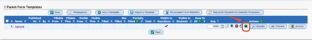 A new tab has been added to view Parent Form Results. This tab can be found from Parents>Forms>Results. The Results screen allows you to view all questions in a form and allows sorting and filtering by the specific answers from each question. In addition, you may add in any additional student columns by use of your already existing Search Result Views (Student Data>Student List>Search Result Views). After adding your columns, sorting and filtering the results, you may then export the data to excel by use of the Excel button at the top of the screen.