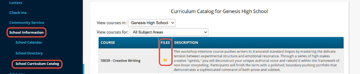 This is a new curriculum catalog screen that will show all catalog files and catalog descriptions for active courses in the student's school.