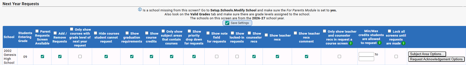 - The screen itself is controlled by the settings on the Parent Access>Setup>Settings>School Settings>Alerts screen: