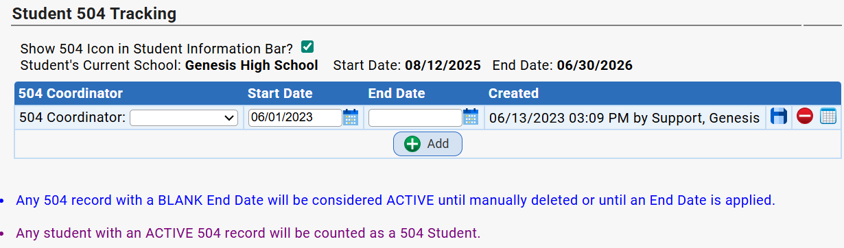 ![]() ![]() | 504 – Add a record via Student Data>Modify Student>Tracking>Other>Student 504. Check off “Show 504 Icon in Student Information Bar?” as well. There is also a “Show 504 Icon” checkbox via Student Data>Modify Student>Demographics>Categories – but the tracking record needs to be added. Any 504 record with a BLANK End Date will be considered ACTIVE until manually deleted or until an End Date is applied. Any student with an ACTIVE 504 record will be counted as a 504 Student. |