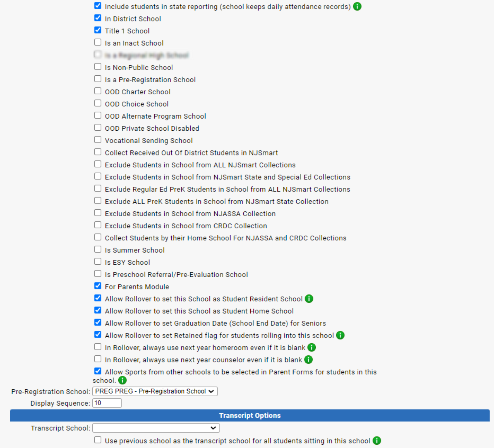 Pre-Registration School | This dropdown should have you Pre-reg school selected in your other schools which have a Pre-reg school. For example, when modifying your High School, you will want to select "Pre-registration" in this spot. The school selected here is the pre registration school that the Registration>Pre Register will default to, when you are under that building. |