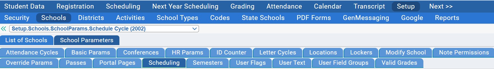 Some additional school-specific scheduling options can be found via Setup>Schools>Modify School>Scheduling.