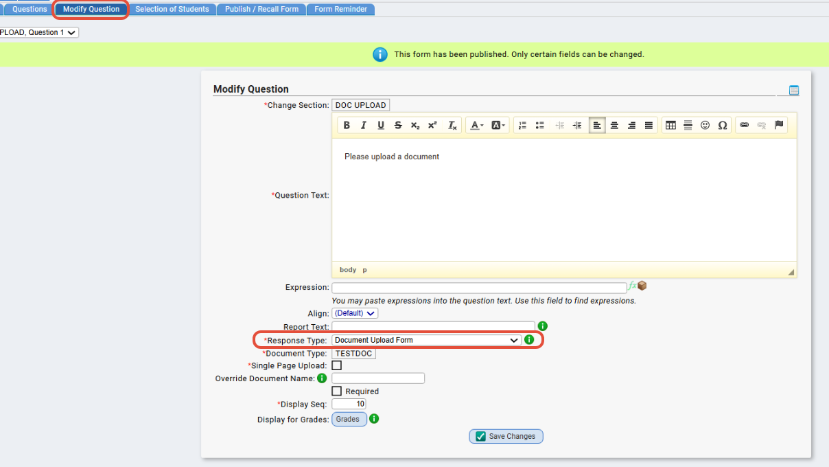 - Once you select "Document Upload Form" as the 'Response Type,' it will enable another option where you must select from one of your Document Types that are labeled as 'used for student documents'. You can review your Doc Types for this option via Doc Mgmt>Setup>Modify Document Type: