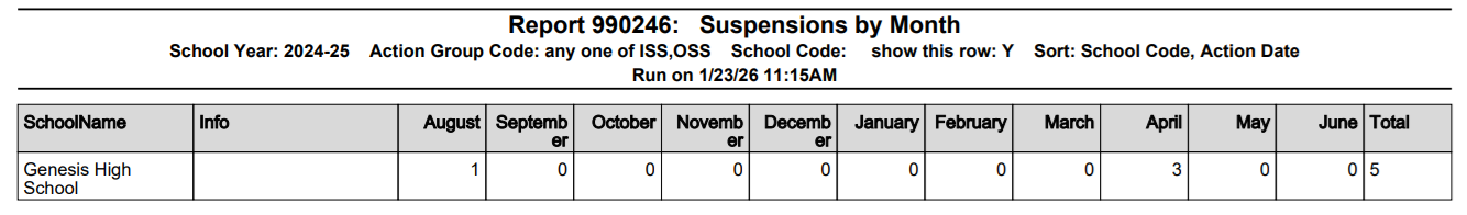 | Suspensions by Month - Download Report A breakdown of total suspensions - ISS & OSS combined - by month for a selected school year. List is by school/month. Shows a row for every in district school that has at least one suspension record. Created by: Jan Last Updated: January 2026 | ![]() (sorry not much data in demo) |