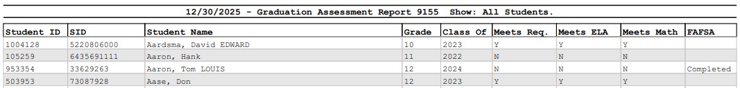 Reports Students of Class 2016 or later who have/have not met Graduation Assessment Requirements.