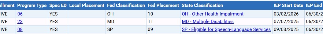 | Special Ed Data | Lists information from student's current IEP record such as IEP start/end dates and classification codes.![]() | Download File |