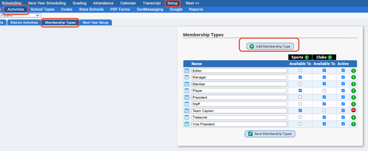 Membership Types are maintained on the Setup>Activities>Membership Types screen: