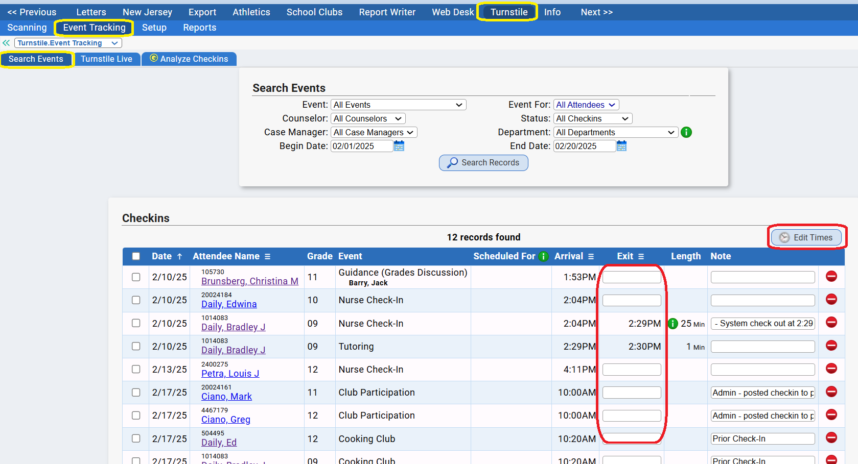 To update times in the Arrival column or existing times in the Exit column on the Turnstile->Event Tracking->Search Events screen., click the "Edit Times" button at upper right. If you do not see this button, you do not have permission to edit the times (see your local system administrator for help). Access to this capability is controlled by the "turnstile.eventtracking.edittimes" Securable Location.