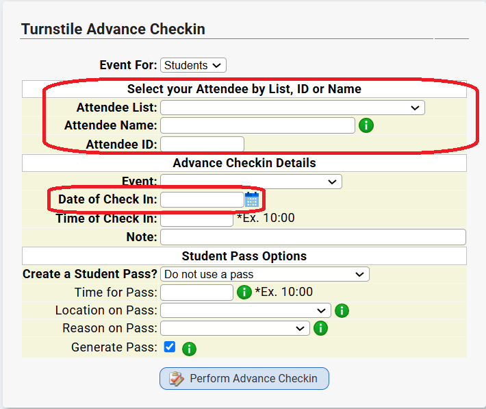 On the Turnstile->Advance Checkin screen, select the students you wish to create the Check-In for and then select a prior date in the "Date of Check In" field: