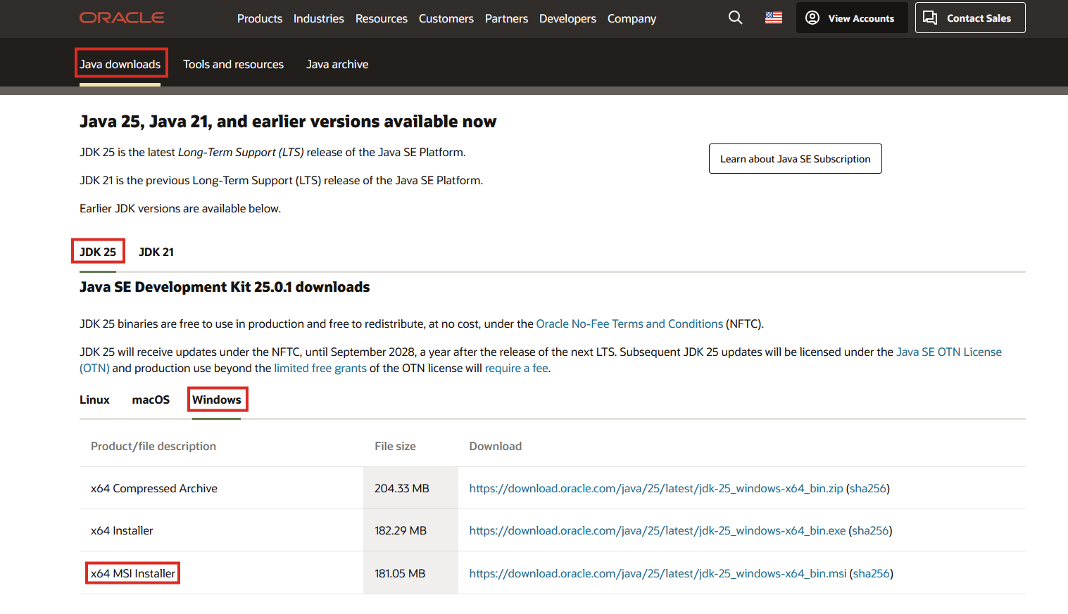 Select Java 25 and Windows OS and download the x64 MSI installer shown in the following screen shot: