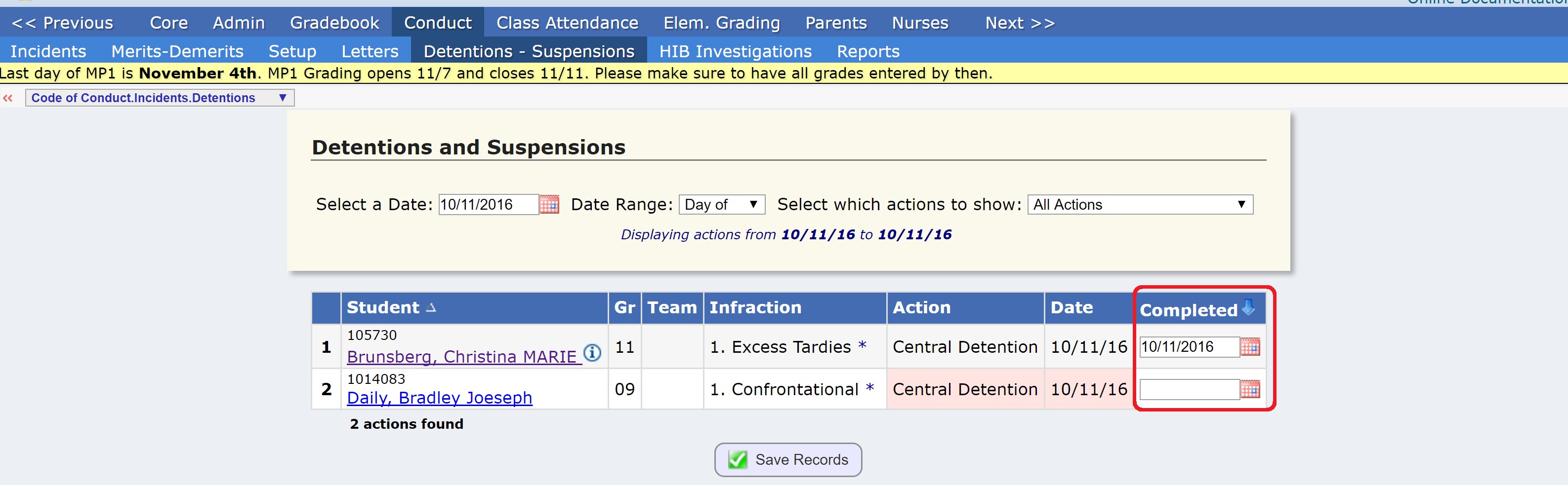 - This information is displayed via the "Completed" column on the Conduct→Detentions - Suspensions screen: