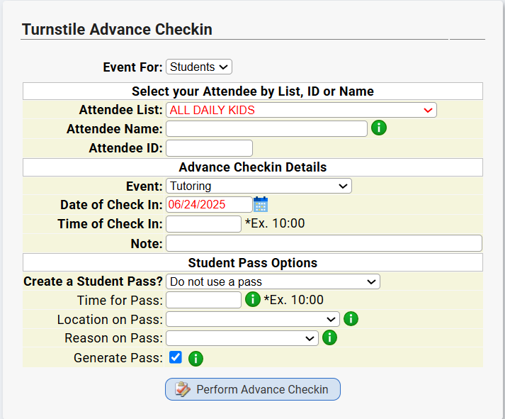 Turnstile's Advance Check-In feature can be used to pre-check students into appointments and then later verify ("Confirm") that they have attended.