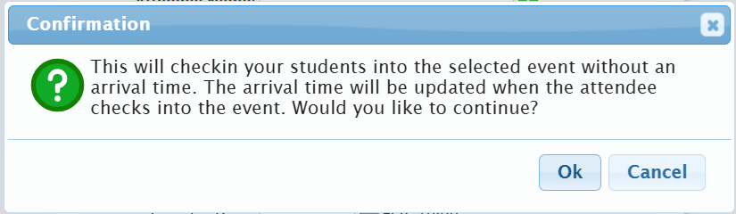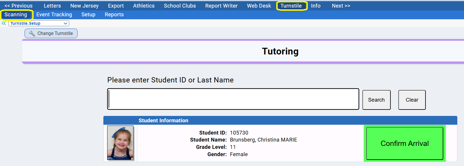 When the "Confirm Arrival" button is clicked, the Turnstile tracking record is updated with the actual time the student was checked in. Checking out is then done normally.