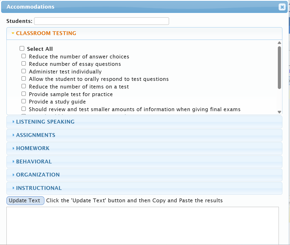 Once setup, the Accommodations tool is available, when editing lesson plans, to add accommodations for students to the plans. The Accommodations tool has up to 7 categories of accommodations: