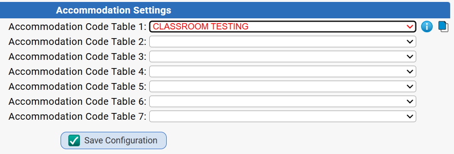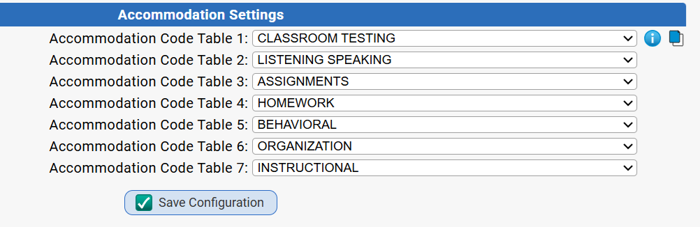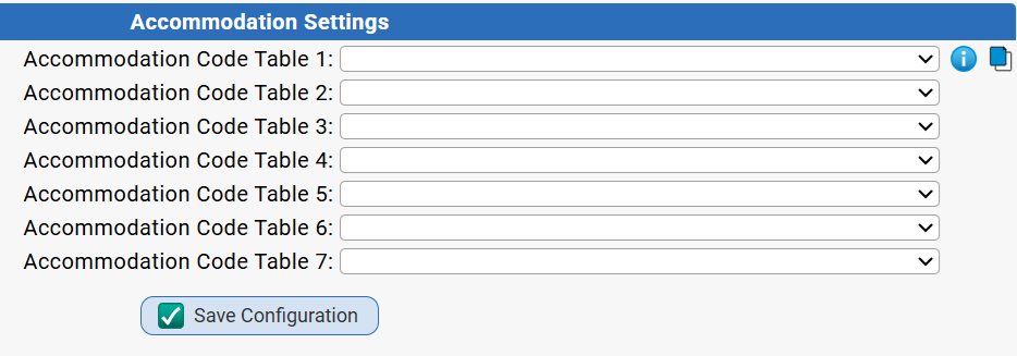 Once you have created at least one Accommodations Codes table, you can set up the Accommodations tool.