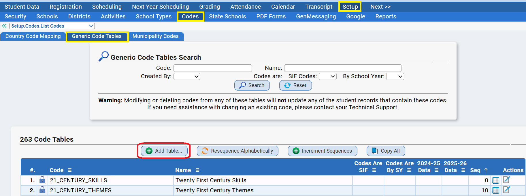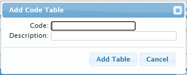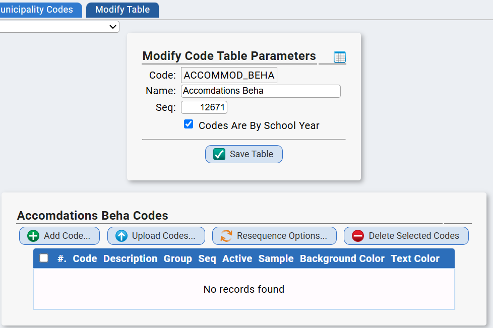- After creating the table, you will be brought to the "Modify Table" screen. The new table will initially have no codes in it (it will be empty
