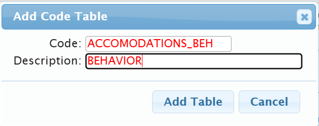 - You must now add all of your individual accommodations for the category to the new table. To do this please follow the directions found here: Editing Codes Tables.
