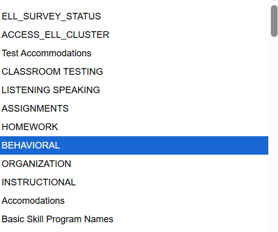 These are not setup for you: the category names as well as the individual lists of accommodations within the categories are setup locally by your district. This article details how to do that setup.
