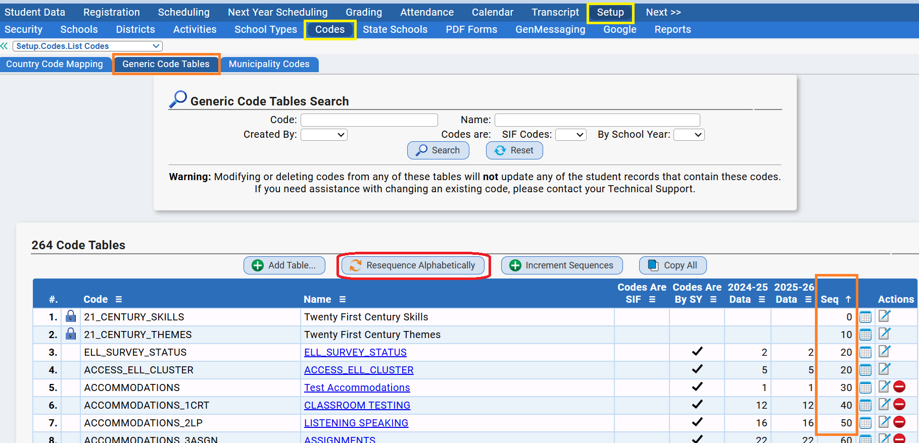 - Initially all of the "Accommodations Codes Table" fields will be empty. To select one of the Accommodations Codes tables you have create, click the drop down for one of the Accommodations Codes Table fields. These will be in the order in which they appear on the Setup->Codes screen (see the Note regarding alphabetizing codes tables).