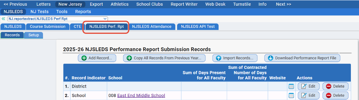 When you first navigate to the NJ>NJSLEDS>NJSleds Perf Report>Records tab, you will likely not have any records in place.