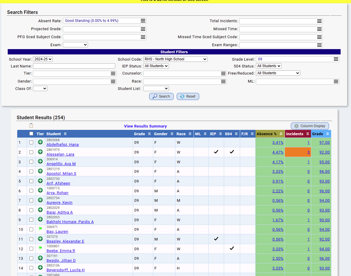 - Each bar/section of the chart is clickable. For example, clicking on good standing on absentee rate for grade 09 will bring you to the following page on the Student Detail Page where you can see the students in the chart