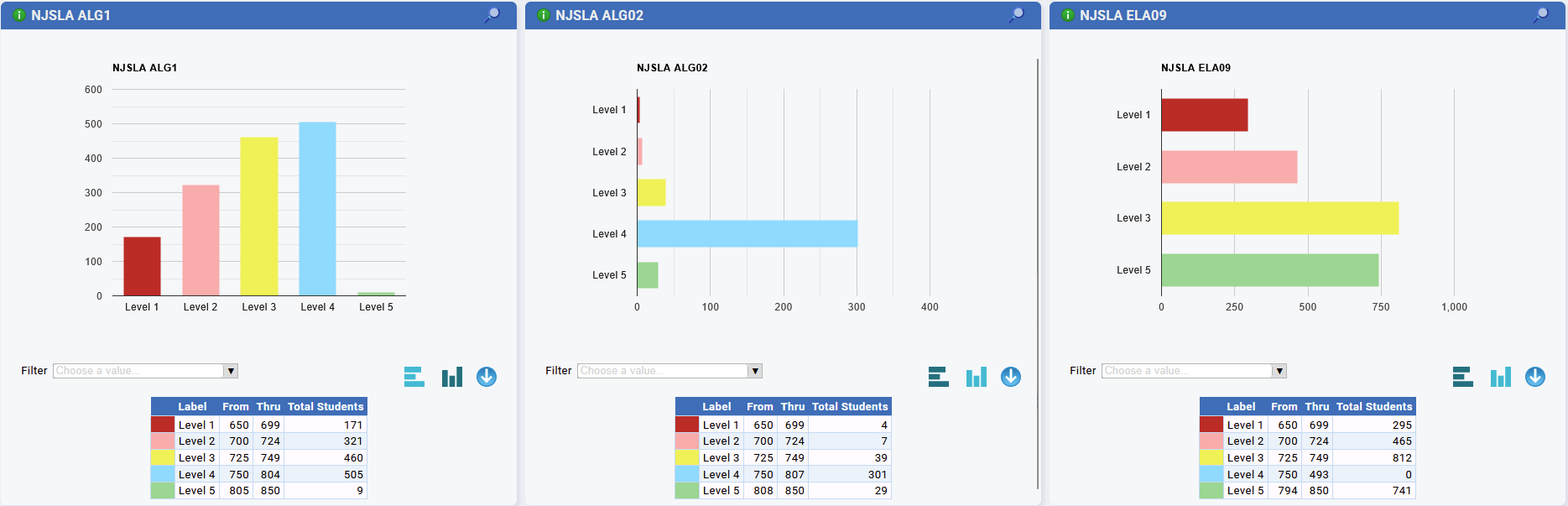 The Assessments Dashboard provides a centralized view of NJSLA test scores based on loaded assessment data. Custom Assessments will also be added to the Assessment Dashboard. Users can filter Assessment data by: