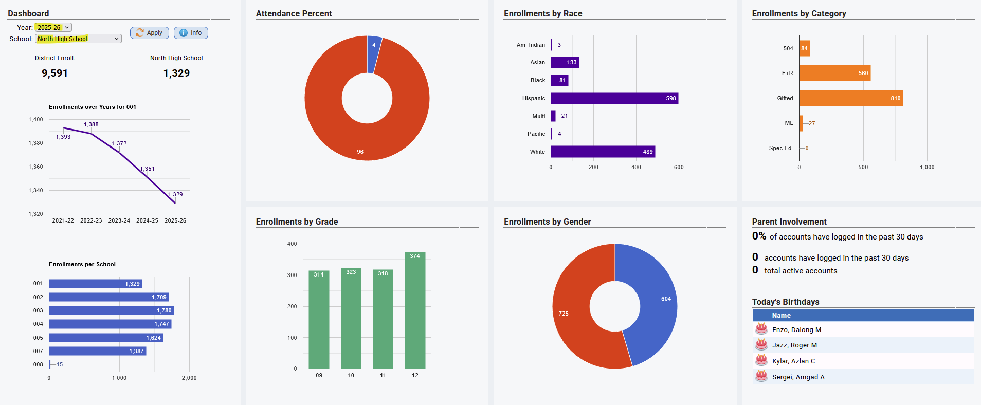 - Detailed Panels: Attendance Percentages, Enrollment by Race, Category, Grade, and Gender.