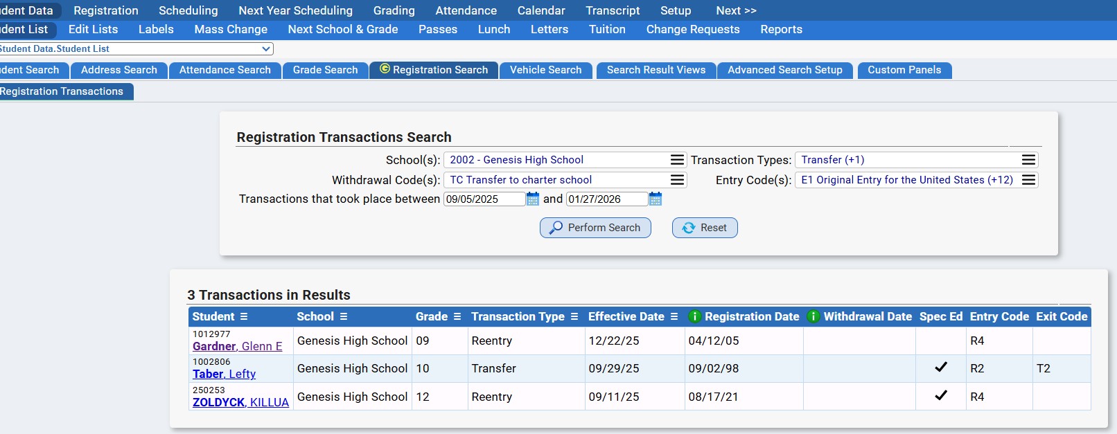 A dedicated screen for searching through Registration Transactions (Entry, Withdrawal, Transfer, etc). This screen is useful for when you want to search for students that entered/withdrew/transferred as of a certain date/date range.